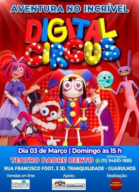 Já no domingo, dia 3, às 15h, será encenado no local O Incrível Circo Digital, que conta a história de uma garota que fica presa em um maluco mundo virtual junto com outros cinco seres humanos e agora está sujeita a estranhas desventuras criadas por uma excêntrica inteligência artificial. A atração é paga e os ingressos podem ser adquiridos pelo link https://www.clubedoingresso.com/evento/aventuranoincrivelcircodigital-guarulhos.