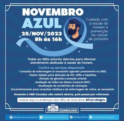 Neste sábado (25), das 8h às 16h, todas as Unidades Básicas de Saúde (UBS) de Guarulhos, exceto a Cavadas, que passa por reformas, estarão abertas para a intensificação das ações da campanha Novembro Azul, de prevenção e diagnóstico precoce de doenças que atingem a população masculina. Já as unidades Vila Fátima, Jardim Paulista, Bananal e Marcos Freire atenderão todos os públicos pelo programa Saúde Agora, prestando os serviços tradicionais.