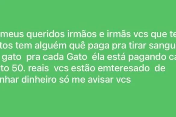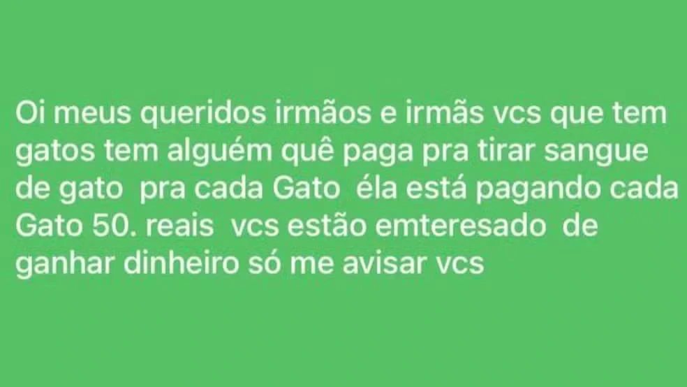 A Polícia Civil prendeu três pessoas na noite de sábado (4) em Monte Alto (SP) por suspeita de participação em um esquema de venda clandestina de sangue de gatos. O caso veio à tona após a divulgação de um anúncio em redes sociais, que oferecia R$ 50 a tutores interessados em submeter seus animais à coleta.