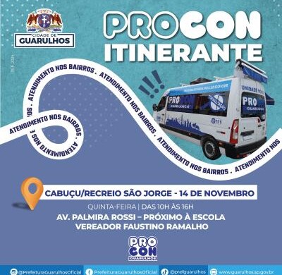 A unidade volante do Procon Guarulhos estará nesta quinta-feira (14) no Recreio São Jorge (avenida Palmira Rossi, próximo à Escola Vereador Faustino Ramalho), na região do Cabuçu, das 10h às 16h, para atender a população do bairro e imediações. A cada semana o veículo da Coordenadoria de Defesa e Proteção do Consumidor leva a um bairro diferente do município os mesmos serviços executados nos postos fixos do Procon.