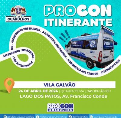 A unidade móvel do Procon Guarulhos estará na quarta-feira (24) no Lago dos Patos (avenida Francisco Conde, s/nº, Vila Galvão) para atender a população das 10h às 16h. O veículo itinerante da Coordenadoria de Proteção e Defesa do Consumidor leva semanalmente a um bairro do município os mesmos serviços prestados nas unidades fixas do órgão.