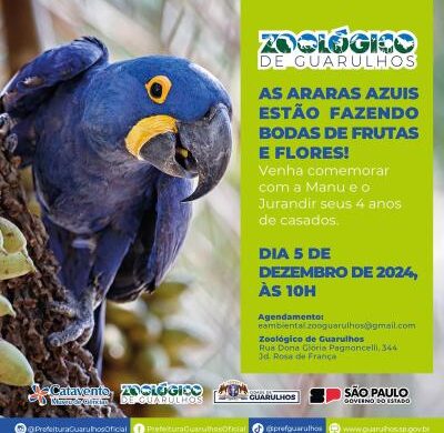 A equipe do Zoológico de Guarulhos preparou uma festa especial aberta ao público para celebrar os quatro anos de união do casal de araras-azuis Manu e Jurandir. A comemoração das bodas de frutas e flores dos pássaros representantes da beleza da fauna brasileira acontece nesta quinta-feira (5), às 10h.