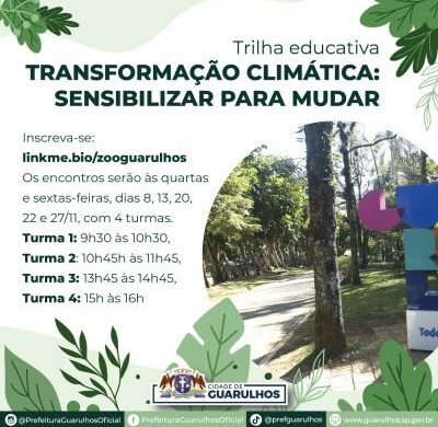 Os efeitos das mudanças climáticas causadas pelas atividades humanas já estão chegando e causando muita apreensão em todo o planeta. Para levar mais conhecimento sobre o tema e também mostrar como cada um pode fazer sua parte para ajudar a preservar a natureza, o Zoológico de Guarulhos promove durante novembro a trilha educativa “Transformação Climática: Sensibilizar para Mudar”.